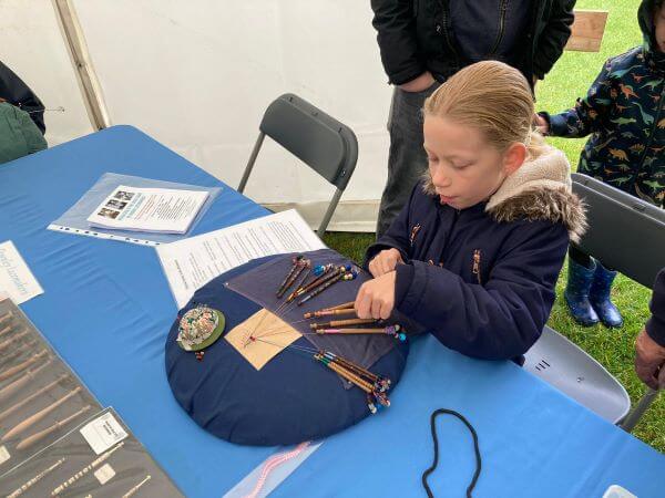In a central marquee, the crafts and heritage of the Chilterns was on show, with local legends such as Stuart King on hand to discuss the history of the bodgers – the woodland woodturners who produced chair legs in the Chiltern Hills. Our Woodlanders’ Lives project had several volunteers demonstrating the craft of lacemaking and helping people have a go. Rosemary and Alex hardly got a break, as this activity was flooded with children of all ages, keen to have a turn and try to complete the lace ‘snake’ design which was worked on throughout the day.