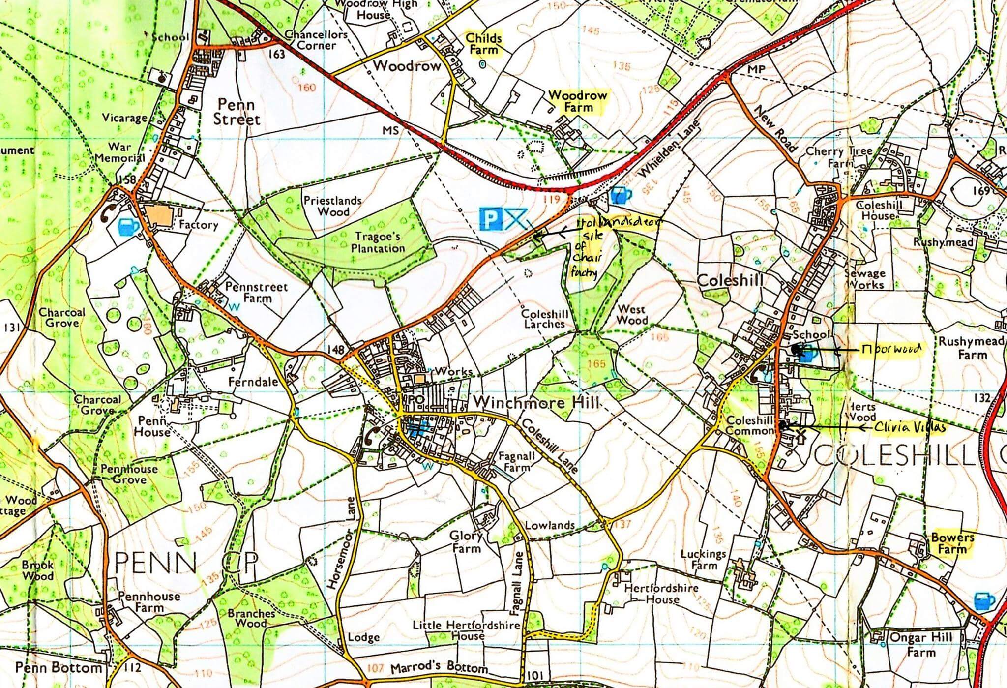 Foreign timber imports began to reduce the need for Chiltern beechwood, and towards the end of the 1930s the small rural chair factories also began to decline when faced with competition from the larger enterprises, mainly in High Wycombe. With the death of his brother Fred, Joe was left to manage and market the firm singlehandedly. He wound up the company and sold the Whielden Lane premises to the Dunmore brothers, timber merchants, at the start of the Second World War. The buildings (which I can remember as a child) were destroyed by fire in the early 1950s. The site was turned into a picnic area in the 1970s or 1980s, but by 2019 it was no longer managed and is now totally overgrown with trees.