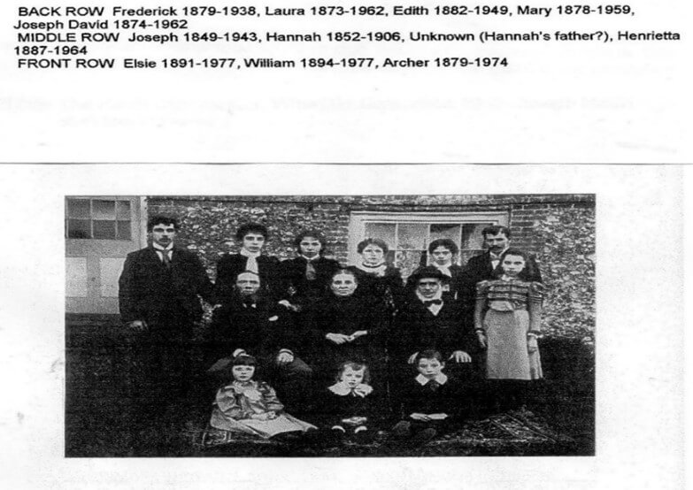 By 1881 he had married Hannah Taylor from Chalfont St. Giles, and had evidently taken over the running of the chair factory from his father, as he was living there with Hannah and five children – William aged 9, Laura 8, Joseph David 6, Mary Ann 4, and Frederick 1. (They went on to have seven more children – Elizabeth, Edith, Edward, Henrietta, Archie, Elsie and a second William, the first William having died aged 14. The photograph below of the family was taken in 1896 after they had moved to Woodrow Farm. The elderly man in the photograph is assumed to be Hannah’s father.