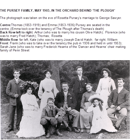 He moved with his parents and the rest of the family to Woodrow Farm in the 1890s, and in the photograph (see above) he is standing on the far right of the back row. In 1903 Joe married Kate Pursey (born 1875), daughter of Thomas Pursey, the licensee of The Plough in Winchmore Hill. Three generations of Purseys were licensees of the pub, starting with Thomas’ father George in the 1870s, followed by Thomas (and then his wife Emma after his death), then Thomas’ youngest son Frank who held the tenancy until 1961. Thomas was also a chairmaker, as were many of the Pursey family. Many members of the Hatch and Pursey families intermarried over three generations, and to examine the complexity of this would require a separate article!