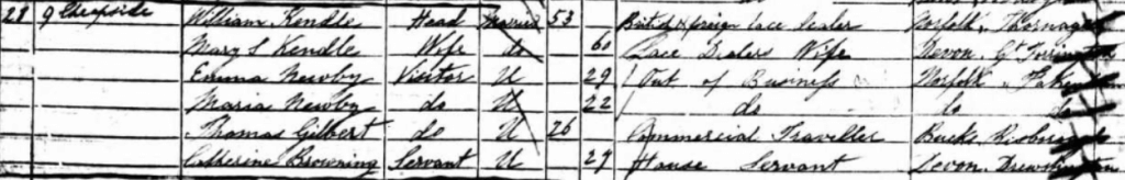 In the 1851 census, Thomas Gilbert was staying with the Kendle family at the London branch of Hearn’s business, as a commercial traveller. Interestingly, two other visitors staying there, Emma and Maria Newby, also had a lace connection – they were daughters of a Norfolk draper; Maria married Daniel Hearn’s managing grocer Frederick Goodeve and Emma married a London lace manufacturer.