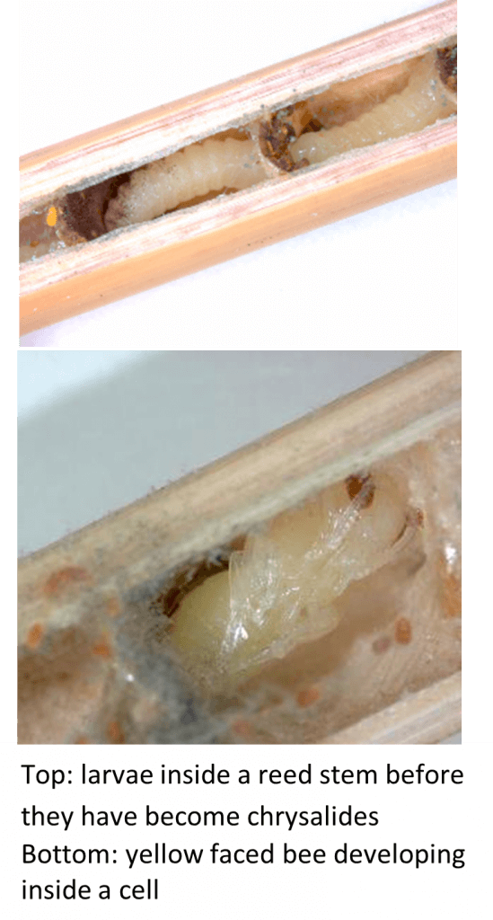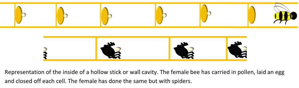 Well, the female bee or wasp takes food into the hole – pollen for bees, aphids and spiders for wasps. When she has enough food deposited, she lays an egg on the food store. She then closes these into the cell by building a wall. This might be from mud carried in or she might scrape the sides of the stick and make a papery substance to close it off. So inside there is a row of cells with food and an egg in.
