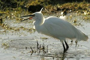 The little egret is a small white heron, with black legs, yellow feet and a long, black bill. During the breeding season, it grows a long, white plume from its crown and longer feathers on its breast. It can be seen all year-round in the UK, but numbers swell in autumn with the arrival of migrants from Europe. Look out for it stalking shallow waters for amphibians, fish, reptiles, birds and crustaceans to feed on.
