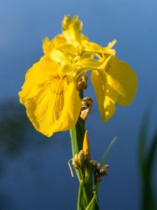 A common plant of wetlands, particularly stream and pond margins, fens and wet woodlands, the yellow flag-iris is easily identifiable when in flower because of its large, drooping, bright yellow petals.
